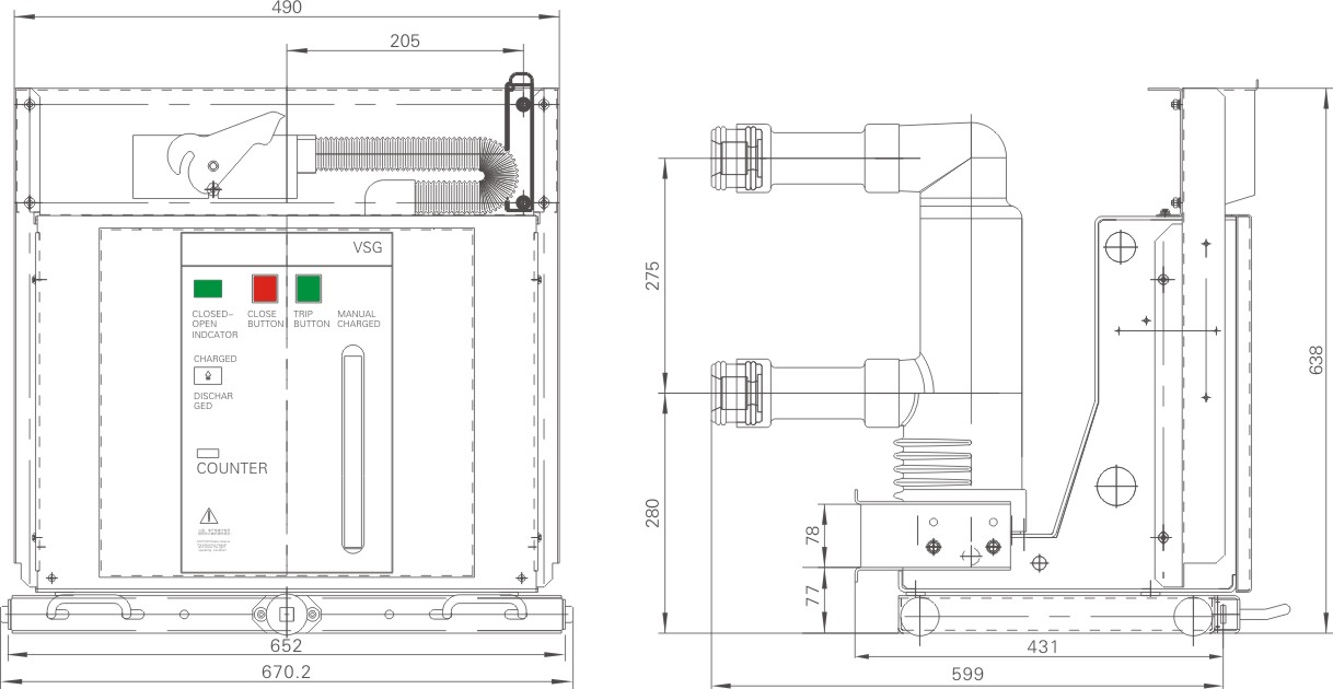 VSG indoor high voltage vacuum circuit breaker is a three-phase AC 50/60Hz, rated voltage of 12kV to 40.5kV indoor switchgear, control and protection for industrial and mining enterprises, power plants and substations, electrical facilities, and for frequent operation place. Adopting Spring operating mechanism and circuit breaker integrated, design can be used as a fixed installation unit can also be equipped with special advance mechanism, the composition of handcart unit used. Some of the main circuit can use the whole solid seal post, in order to achieve smaller circuit breakers, high reliability, maintenance-free, can be equipped with KYN28A and other handcart switch cabinet in the home can also be used with fixed XGN switchgear.