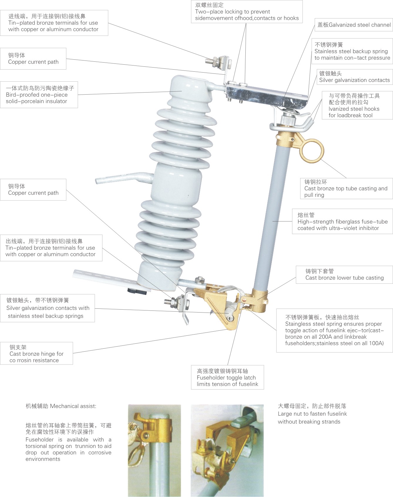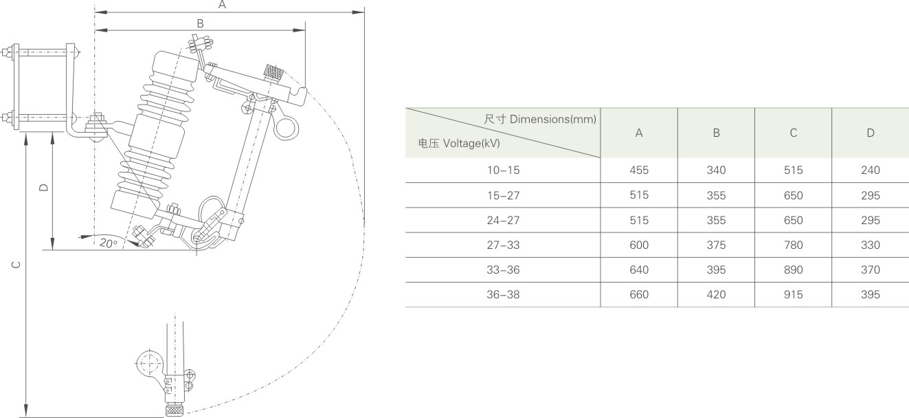 (H)RW12-12(F) outdoor high voltage AC drop fuse (hereinafter referred to as "fuse"), suitable for outdoor overhead power distribution system with rated frequency 50Hz and rated voltage 10kV, as overload or short circuit fault of power system Protective element of a circuit or electrical device. When the fuse is in normal operation, it is connected in series in the power line, the fuse is in tension, and the movable joint is locked. When the line fails, the fault current causes the fuse to blow, the movable joint is released, the fuse is quickly dropped, the circuit is cut off, and the protection of the line and equipment is safe. The load type fuse adds a spring contact and an arc extinguishing cover on the basis of the common type, and is used for dividing the load current in the power system. The fuse meets the technical standards of GB/T 15166.3-2008 "High Voltage AC Fuse Part 3: Jet Fuse", DL/T 640-1997 "Outdoor AC High Voltage Drop Fuse and Fuse Parts Ordering Technical Conditions".